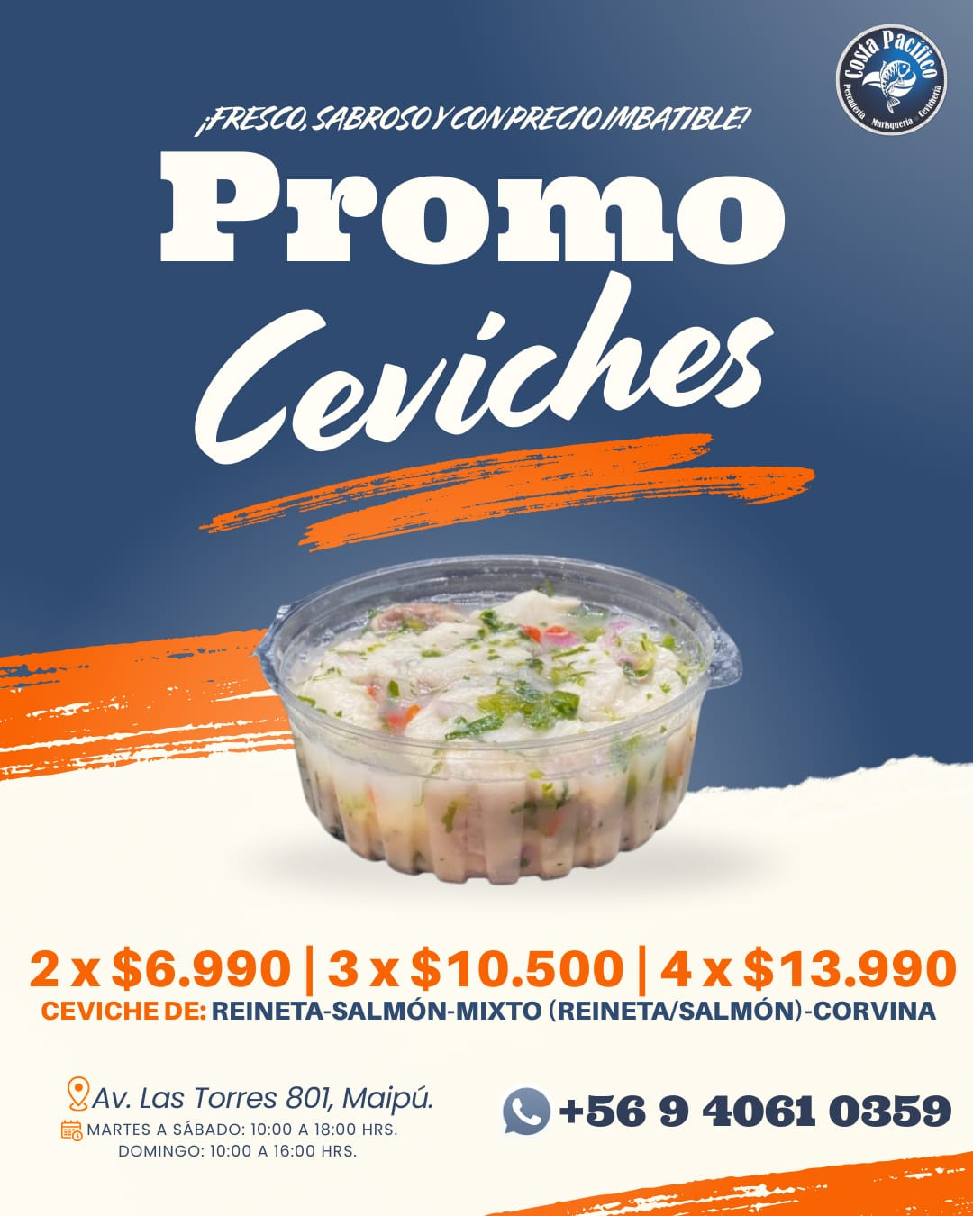 ¡Fresco, sabroso y con un precio imbatible! Disfruta de la máxima calidad marina con nuestra selección de ceviches del día, preparados con ingredientes seleccionados para garantizar una experiencia única en cada bocado.